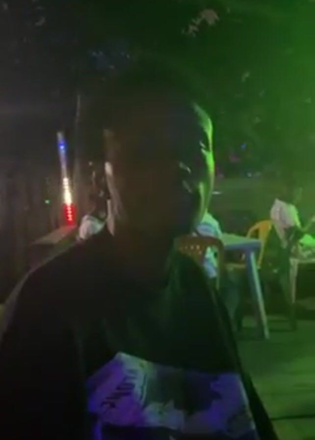 A person with dark hair and skin, wearing a black t-shirt with a graphic print, sits at a table outside at night, holding a clear plastic cup. Other people are sitting at tables in the background. A television screen showing a soccer game is visible in the background. The scene is lit with green light, possibly from decorative lighting.