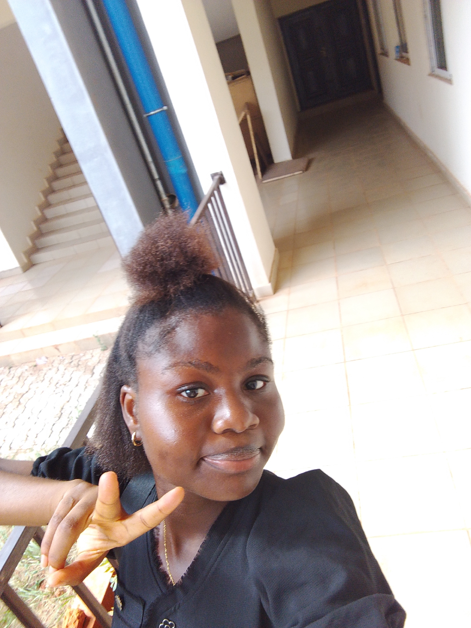 A young, dark-skinned woman with hair styled in a high bun is taking a selfie. She is wearing a black shirt, a gold necklace and gold hoop earrings. Her left hand is raised, fingers spread in a peace sign. She stands on a tiled balcony or patio with a low railing. Behind her, there is a tiled hallway leading to a dark doorway, a staircase and a blue pipe running vertically. The location is likely in Nsukka, Nigeria.