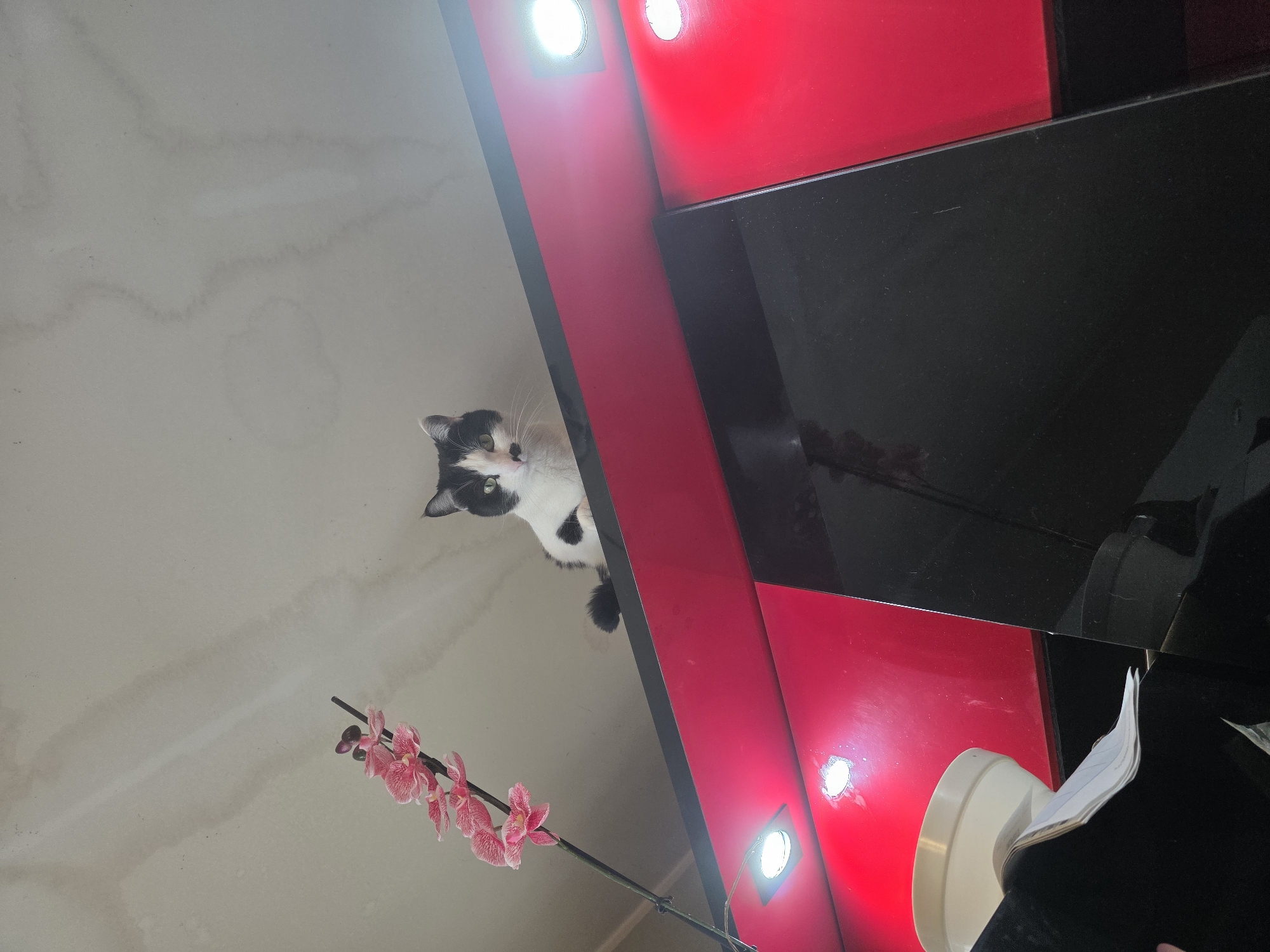 A low-angle shot shows a black and white cat partially visible in the upper left. It peers down towards a pink orchid in the lower left corner, against a beige surface. A red and black structure with embedded lights angles across the middle of the frame from the upper right to the upper left. A white cylindrical object with papers is present in the lower right corner. The location is Unknown, Unknown.