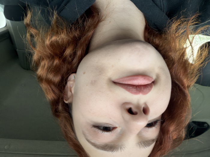 The scene is located in the city of Illkirch-Graffenstaden, France, and features a close-up, chest-up portrait of a single individual within what appears to be the interior of a vehicle. The subject is a young adult female with fair skin and shoulder-length, wavy, reddish-auburn hair. Her gaze is directed upwards and to the right of the frame, with her mouth slightly open, revealing pink-toned lips enhanced with lipstick. A small, light-colored stud earring is visible in her left earlobe. Minor skin irregularities, including a small mole and a faint mark, are present on her left cheek/jawline. She is wearing a dark, possibly black, hooded garment. The background is out of focus, showing a bright, diffused light source and hints of green foliage through a window on the left, and darker vehicle interior elements on the right and top. Natural lighting illuminates the subject primarily from the left.