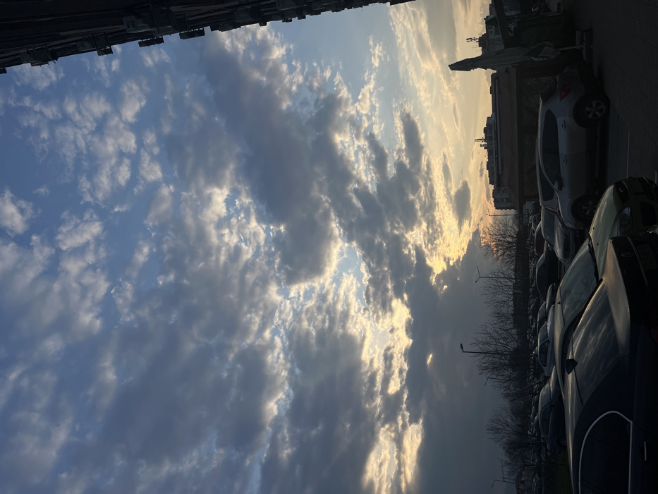The image presents an urban landscape at dusk or sunset in Plovdiv, Bulgaria. The sky is dominated by an extensive layer of stratocumulus clouds, appearing dark grey in most areas, with lighter, whiter segments and distinct breaks revealing patches of blue sky, particularly in the upper right quadrant. The low sun, largely obscured, emits a warm yellow and orange glow that diffuses through the cloud breaks across the mid-sky. The foreground and midground feature a large, open-air asphalt parking lot filled with numerous parked vehicles, including sedans and SUVs of varying dark and light colors. A dark sedan is prominent in the immediate lower-left, and a silver SUV is visible slightly to the right of the center. Scattered bare deciduous trees and several tall streetlights with single luminaires are present within and around the parking area. On the far right, a dark, multi-story building, characterized by multiple rectangular protrusions along its vertical facade, occupies the frame's edge. Adjacent to this structure, a large, folded-up green outdoor umbrella or awning is partially visible. In the background, a distant urban skyline composed of various low-rise buildings extends horizontally, with the faint outlines of mountains visible on the far left horizon. No individuals are discernible within the scene.