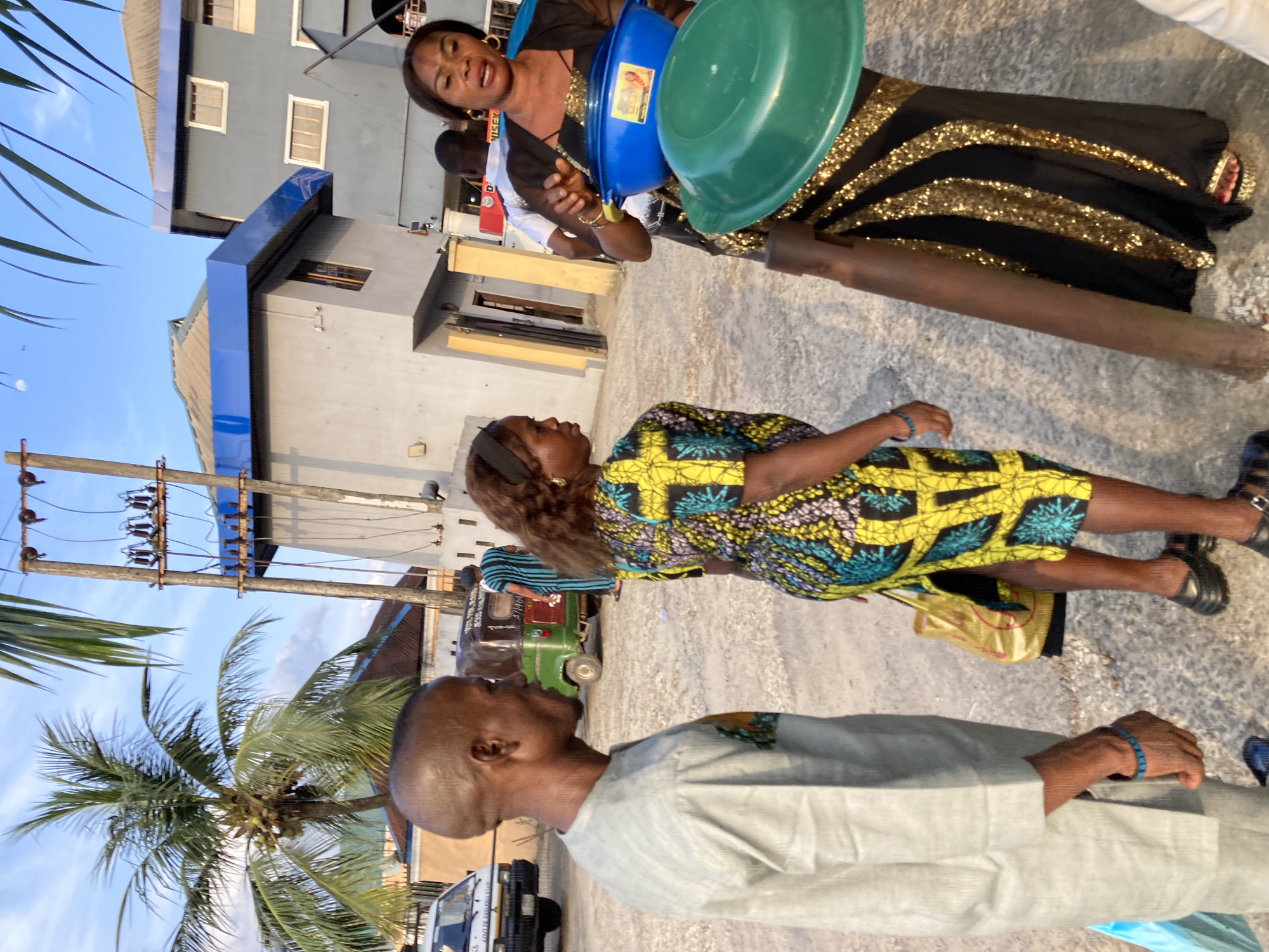 Captured in Aba, Nigeria, the image shows several individuals on what appears to be a city street. A woman in a black and gold dress holds two plastic bowls, one blue and one green. Another woman wears a dress with yellow, blue, and black patterns. An older man is seen in a light-colored traditional outfit. In the background, there is a green "keke" (auto-rickshaw) and parked vehicles. Buildings with blue architectural accents are also visible. The scene is illuminated by natural sunlight.