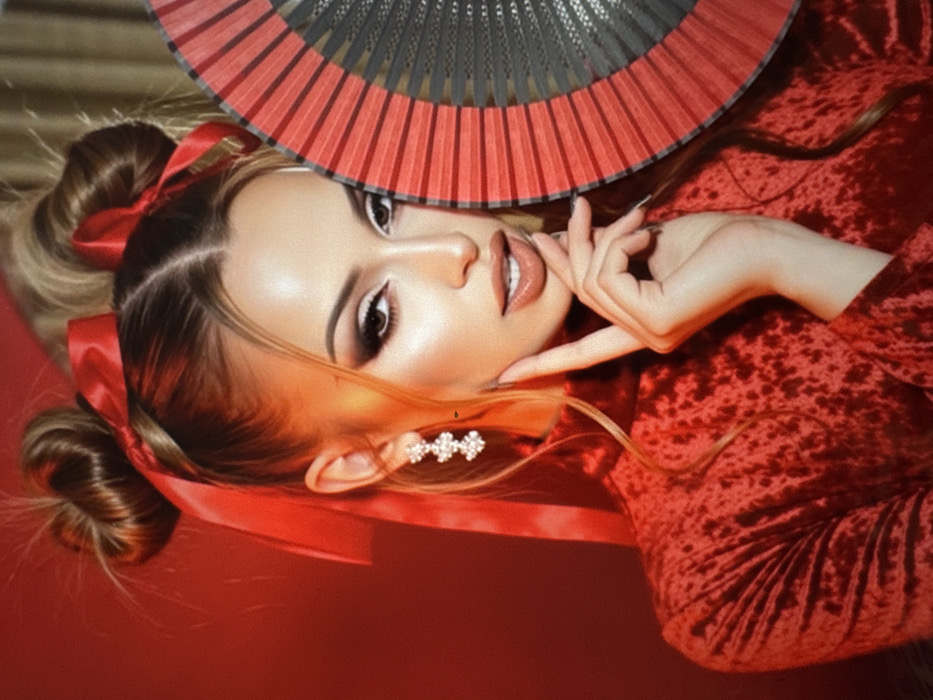 A female individual is depicted in a medium-close-up shot against a solid red background. She has blonde hair styled into two high buns, each secured with a bright red satin ribbon tied into a bow. Her face features extensive makeup, including dark winged eyeliner, a white inner corner highlight, and light brown lipstick. She wears a high-necked, long-sleeved garment made of textured, crushed red velvet fabric. On her left ear, a dangling earring with three linked clusters of clear stones is visible. Her left hand is raised, with the index finger and thumb lightly touching her jawline. Her right hand holds a partially open folding fan with red and black panels and black ribs, which covers the lower right portion of her face. Her gaze is directed towards the viewer. The location is an unidentifiable indoor setting. Location: Unknown, Unknown.