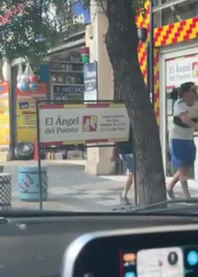 street scene viewed from inside a car. In the initial frame, there's a sign for "El Angel del Puente" and two people on the sidewalk. One person is partially obscured by the sign. As the car moves, the sign is fully visible, displaying business hours and contact information. The car then makes a right turn at a corner. There is a no-parking sign posted and a sign that reads "Baterias" indicating batteries are sold nearby. After the turn, traffic is visible on the street, with several cars including a silver Toyota Corolla. The overall environment is urban with buildings and trees lining the street. The weather appears to be sunny.