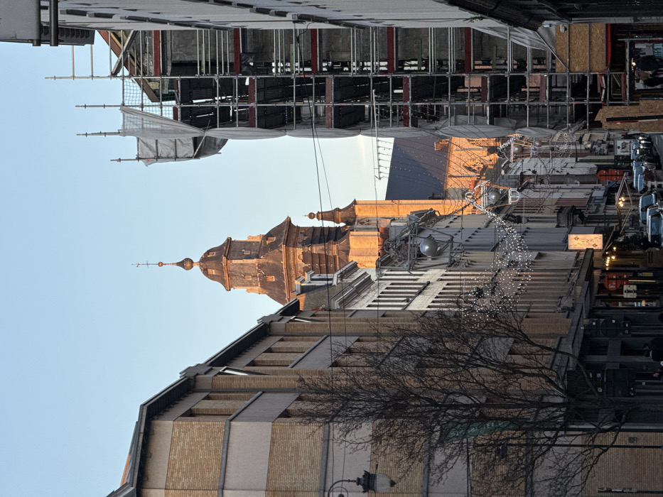 The image displays a narrow urban street scene in Brussels, Belgium, with the **Church of Saint Nicholas** prominent in the mid-ground. The church's distinctive octagonal tower, topped with a domed steeple and finial, is illuminated by warm, low-angle sunlight against a clear, pale blue sky. On the left, multi-story buildings with varied architectural styles line the street. A foreground building features light-colored brickwork and horizontal concrete bands, partially fronted by a bare-branched deciduous tree. An ornate black street lamp with a glass fixture extends from this building. Decorative string lights with small, spherical bulbs are suspended across the street further into the scene. On the right side, a multi-story building is entirely enveloped in metal scaffolding and white protective netting, indicating active construction or renovation. The street itself recedes into the distance, with parked vehicles visible along its length. Several indistinct human figures are visible walking on the sidewalks in the lower portion of the image. The foreground and lower building sections are in shadow, contrasting with the sunlit church tower and upper parts of distant structures.