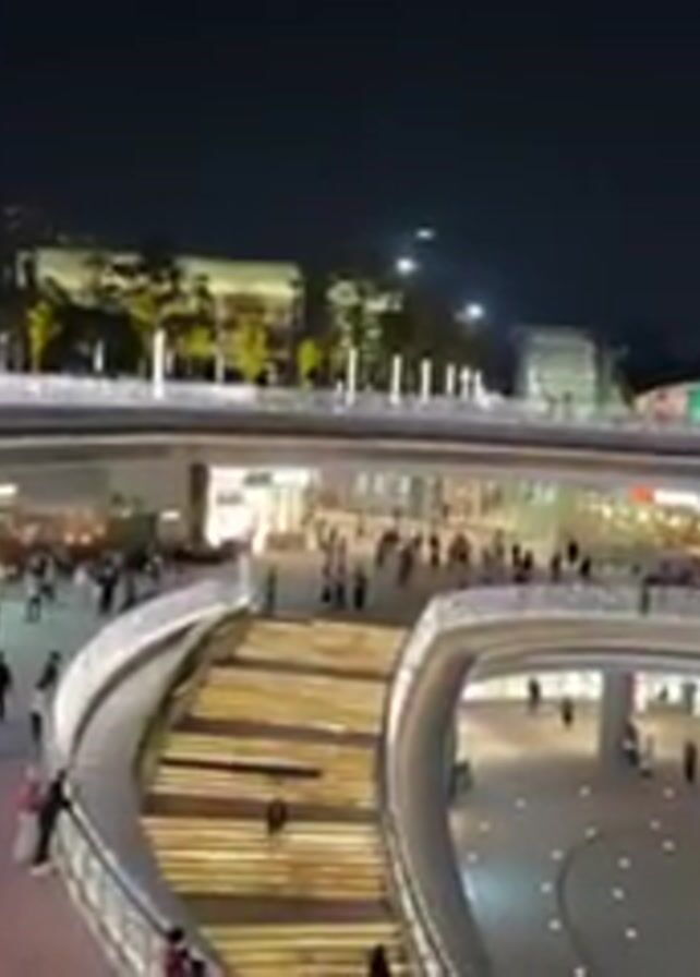 At night, an elevated shot shows a multi-level outdoor shopping mall