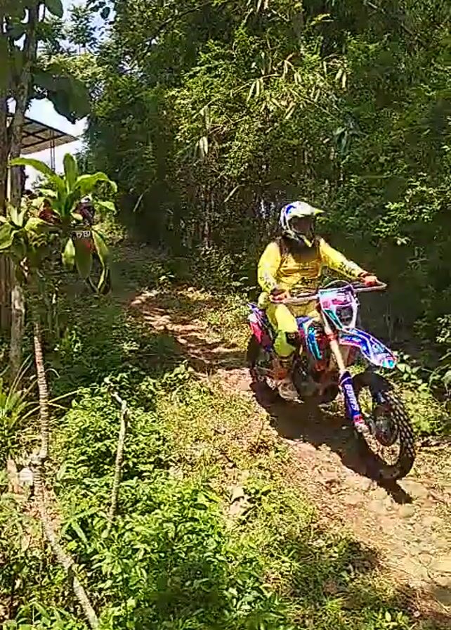 A group of motocross riders navigate a narrow, dirt path through a lush, green landscape. The camera, oriented vertically, captures the scene from the side of the trail. The first rider, clad in yellow gear, approaches cautiously. Next, a rider in vibrant pink races along the path, kicking up dust. The camera then zooms in on the pink-clad rider as they momentarily pause. In the background, a serene rice field stretches to the horizon. The scene is a mix of natural beauty and the thrill of motocross.