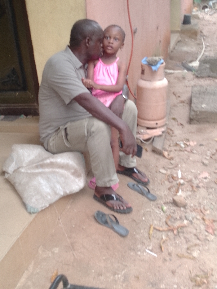 The image depicts an adult male and a young child situated outdoors in the city of Unknown, Unknown. The male, with dark skin and a shaved head, wears a light brown polo shirt and light brown trousers with black sandals, seated on a light-colored sack or cushion. He holds a dark-colored smartphone in his left hand. A young child, with dark skin and short hair, dressed in a pink sleeveless top, is seated on the male's lap, looking forward. The male's face is positioned near the child's left cheek. The ground is uneven, composed of reddish-brown dirt, gravel, and scattered debris including dried leaves and small stones. Three pairs of footwear, including black sandals worn by the male and two pairs of grey/black flip-flops, are visible on the ground. In the background, a light-colored wall with a brown door frame is present on the left, and a beige gas cylinder with a blue cloth on top is visible on the right. A red hose or cable runs vertically along the wall behind the cylinder. Irregular concrete blocks are scattered on the ground near the cylinder.