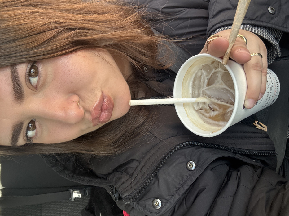 A female subject is depicted in a close-up portrait within the interior of a vehicle, visible by a dark car seat and a metallic seatbelt buckle in the background. Her brown hair frames her face, which features brown eyes and a small gold hoop nose ring on her left nostril. Her lips are pursed. She wears a dark, possibly black, puffer-style jacket over a dark patterned garment. Her right hand, adorned with multiple gold-colored rings and dark fingernail polish, holds a white paper cup containing an iced beverage with a white straw. Text partially visible on the cup includes "Sweet Day" and "Decaf French Cafe." Simultaneously, the subject holds a light brown, hand-rolled cylindrical object between her right index finger and thumb. The specific location within the city of Ramat HaSharon, Israel, is not discernible from the provided image.