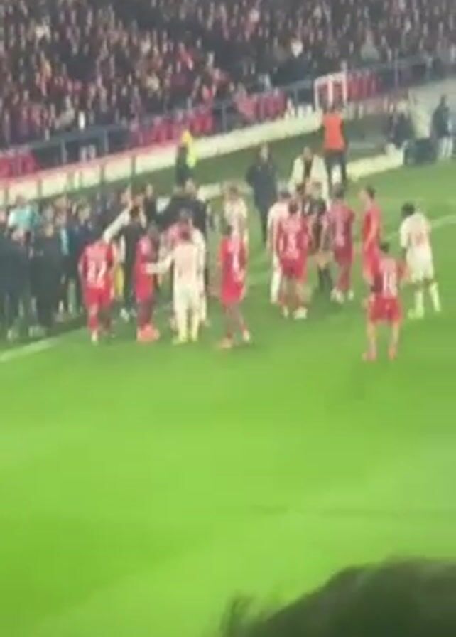 soccer game with players wearing red uniforms arguing with players in white uniforms near the sideline. There is a crowd in the stands behind them, and some other people in jackets near the players. The players are gesturing and talking heatedly, and there appears to be some pushing and shoving. A referee is also present, trying to keep the players apart. The field is green and well-lit.