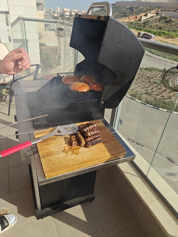 A daytime photograph depicts an outdoor grilling operation on a high-rise balcony in Karmiel, Israel