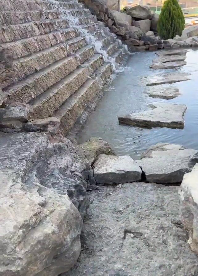 The video pans up from stone slabs near a body of water to show a cascading waterfall made of stacked flat stones. Water flows down the stepped structure and into a small pond. The waterfall is surrounded by more rocks and some greenery.