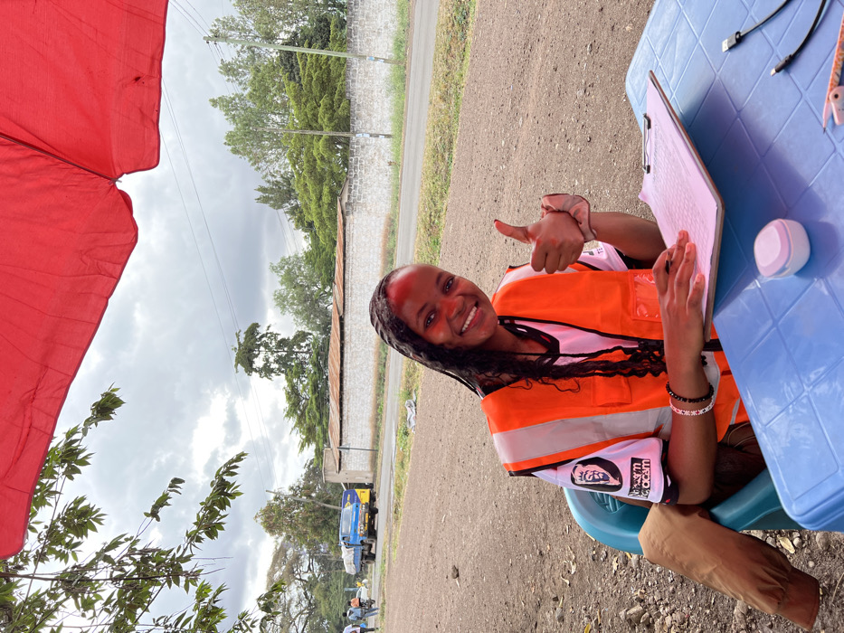 An outdoor scene in Usa River, Tanzania, shows a young Black female seated at a light blue plastic table under a red fabric canopy. She is smiling directly at the viewer, giving a thumbs-up gesture with her right hand. Red pigment is present on her forehead and cheekbones. She wears a black and white t-shirt covered by an orange high-visibility vest. Her left hand rests on a clipboard with papers. On the table, to her right, are a white and pink earbud case and several charging cables. The background reveals a dirt path leading to a paved road. Across the road, a white concrete block wall with a building featuring a rusty corrugated iron roof behind it is visible. Numerous green trees and utility poles with power lines line the horizon. To the far left, a blue flatbed truck covered with a white tarp is on the road, alongside several individuals and a yellow vehicle. The sky is overcast with heavy cloud cover. Green foliage from an overhead tree extends into the upper left corner of the frame.