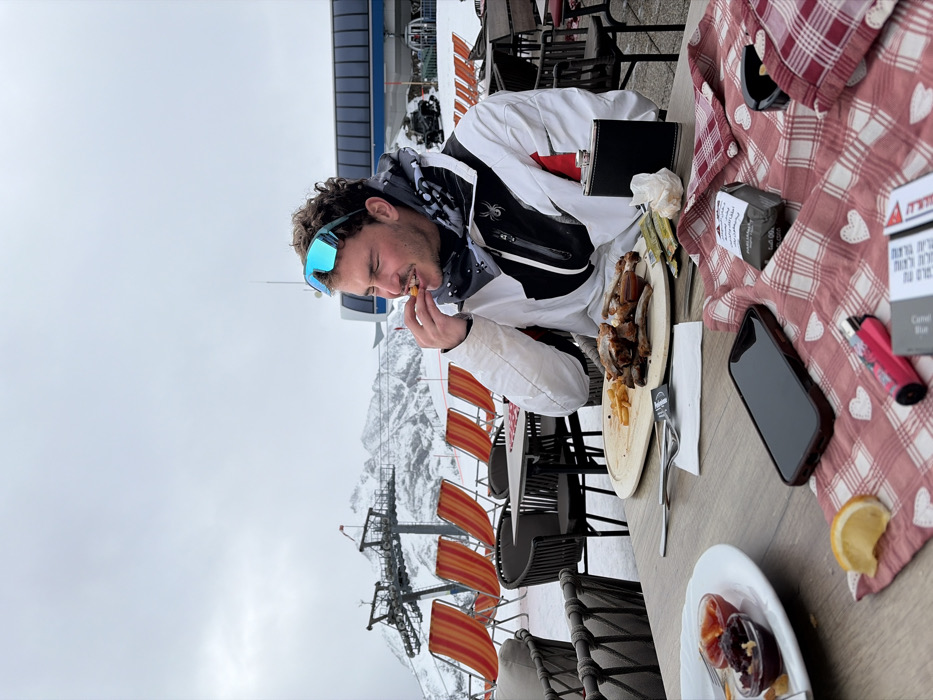- "An outdoor, eye-level photograph captures a man eating a meal at a wooden table in a snowy mountain environment, identified as a ski resort in Finkenberg, Austria" by FM-OzlZ32, licensed under CC BY 4.0