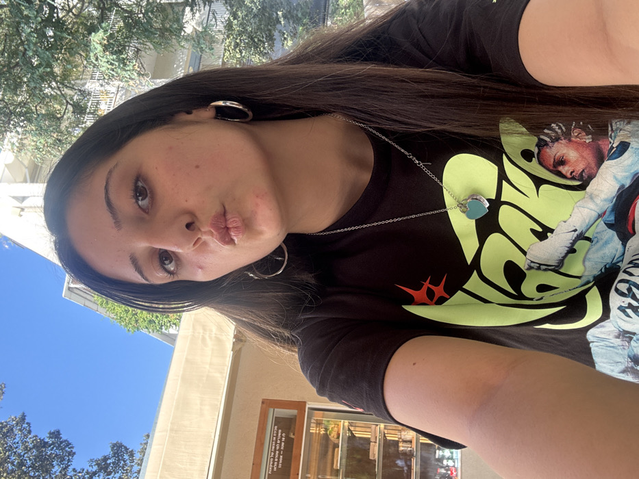 A young woman with long, dark hair and fair skin is depicted in a close-up selfie, looking directly at the camera with puckered lips. She wears a black short-sleeved t-shirt featuring a large light green graphic and a print of A$AP Rocky. She accessorizes with large silver hoop earrings and a silver chain necklace with a turquoise heart-shaped pendant. The background reveals an outdoor urban setting in Tel Aviv, Israel. To the left, a light-colored building displays a window with visible Hebrew text, identifying it as a commercial establishment, likely a cafe or shop. To the right, green foliage from trees and another light-colored building are visible under a clear blue sky.