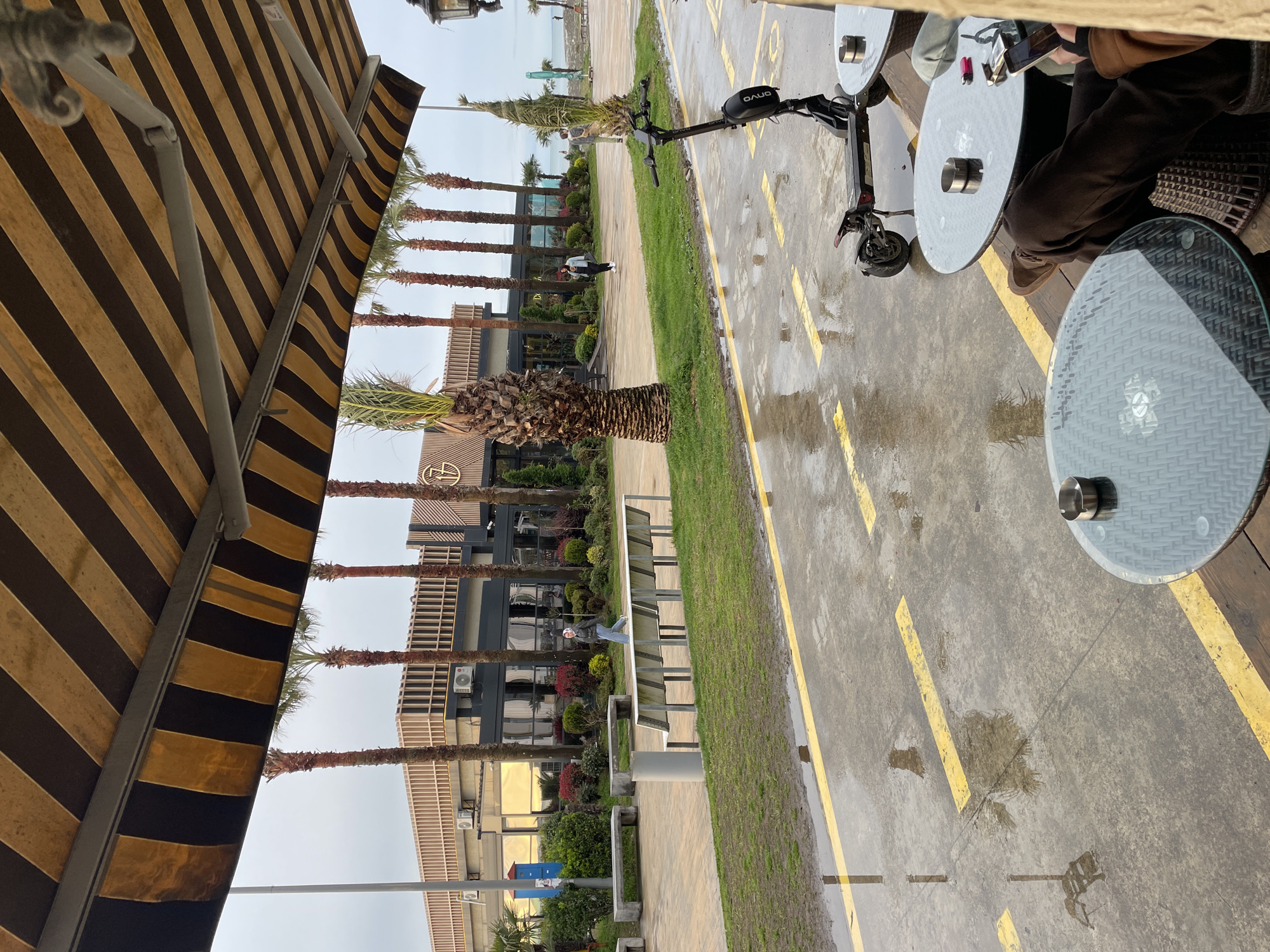 The image depicts an outdoor scene in Batumi, Georgia, near the Black Sea coast. **Setting:** A paved promenade lined with palm trees and modern buildings. The pavement has yellow lane markings. A grassy strip runs parallel to the promenade. **Objects:** A striped awning is visible in the foreground. Several round outdoor tables with metal mugs and ashtrays on them. A parked electric scooter is nearby. **People:** A person is seated at one of the tables. In the distance, a person is walking on the promenade. **Environment:** The weather appears overcast, and the pavement is wet, suggesting recent rain. **Location:** The presence of palm trees and the Black Sea view confirm the location as Batumi, Georgia.