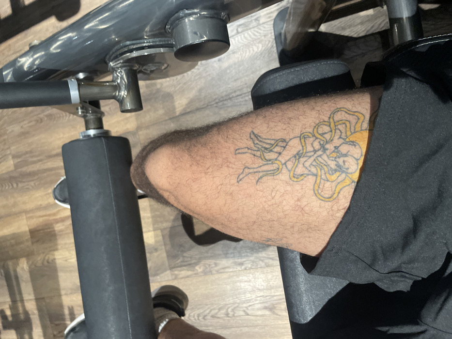 A person's leg is visible, adorned with a tattoo depicting two nude figures and yellow line details, positioned on a gym machine