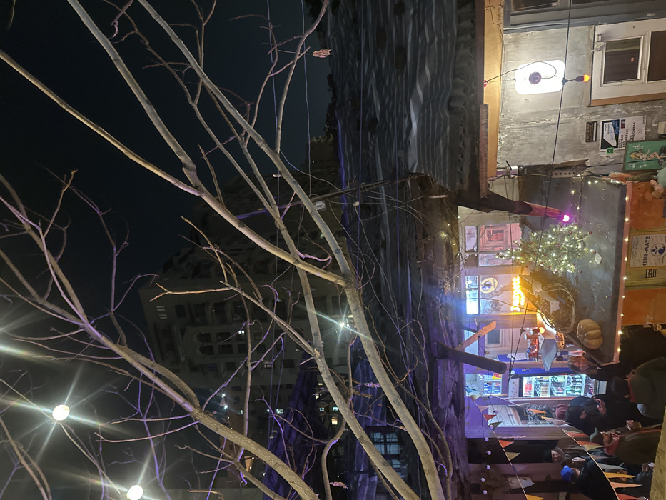 A night scene displays bare tree branches against a backdrop of buildings. One building features decorated windows and a small Christmas tree. People gather underneath pennant-style flags. A structure constructed of corrugated metal flanks the right side, with lights, posters, and windows visible. A building with lit windows is seen in the background.