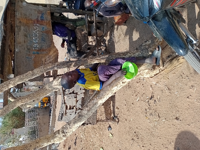 The scene is an outdoor, dry, dusty environment in Kabuga, Nigeria. A young Black male child, approximately 6-8 years old, wearing a yellow and blue t-shirt and purple trousers, is seated on a light-colored, multi-trunked tree that angles diagonally across the frame. He holds a bright green plastic bowl in his left hand. His left foot is bare, and his right foot wears a black flip-flop. His gaze is directed upwards and to the right. Behind the child and tree, a rudimentary wooden structure or stall is present, constructed from planks and what appears to be a large piece of weathered plywood or metal sheeting. This sheeting bears faded blue markings, including the number "19453557" and the word "Western." Beneath this structure, partially obscured, an adult figure is visible, seated, wearing dark blue clothing. Further to the right, a second individual, possibly another child, is partially visible near the base of the structure. In the lower right foreground, the front wheel and fender of a black motorcycle are visible. The ground is dry, reddish-brown earth, with some scattered detritus. In the mid-ground left, behind the tree, a low concrete wall topped with white metal fencing is visible. Behind the fence, a yellow motorized tricycle (auto-rickshaw) is parked. The sky above is clear and bright.