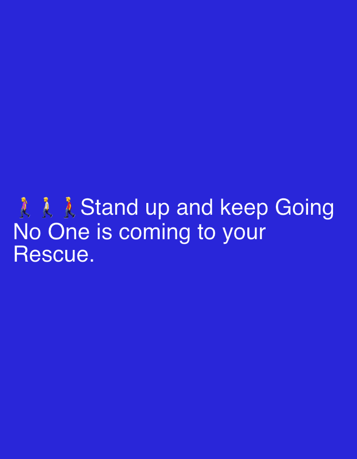 The image, a digital graphic observed in the city of Tundun Wada South, Nigeria, features a uniform royal blue background. Prominently displayed in white sans-serif font is the text: "Stand up and keep Going No One is coming to your Rescue." This message is arranged in two lines, with the first line preceded by three emoji figures. The figures are depicted in a walking stride, facing right. From left to right, the first figure is blonde-haired, wearing a pink top and dark trousers; the second is blonde-haired, wearing an orange top and dark trousers; and the third is red-haired, wearing a red top and dark trousers. All elements are two-dimensional graphical representations.