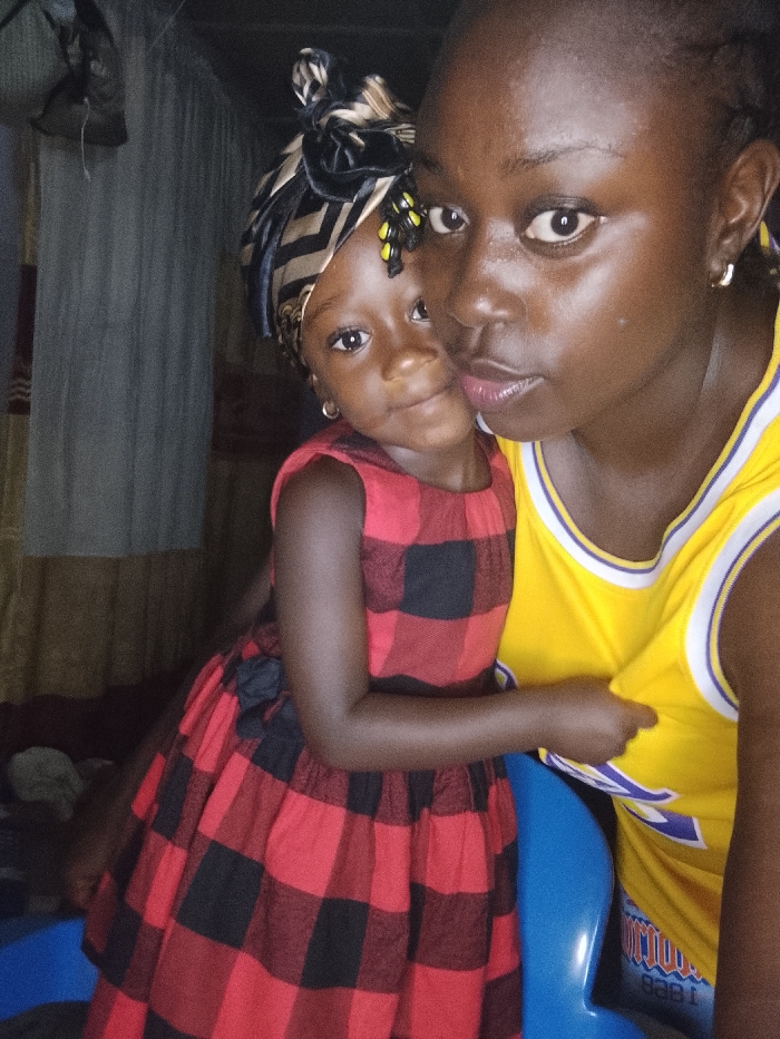 A young woman and a little girl are close together. The girl wears a red and black plaid dress and a headwrap with yellow and black beads. She smiles subtly at the camera. The woman wears a yellow jersey with purple trim and looks seriously into the camera. Both have earrings. The lighting is dim. A mosquito net is visible in the background. A blue object is beneath the adults arm.