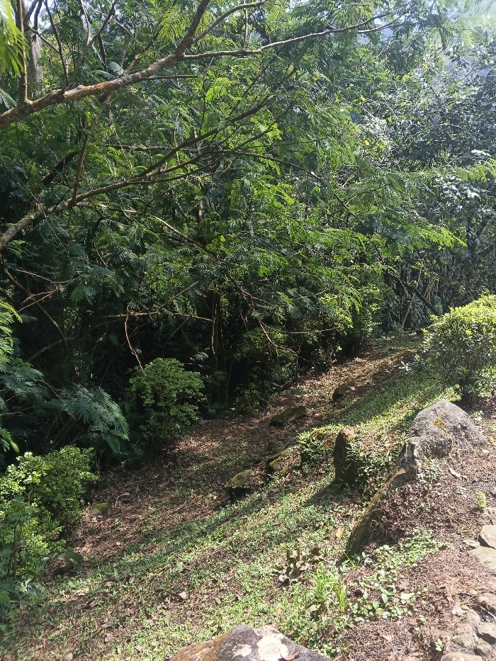 This image displays a natural, vegetated landscape, identified as being in Baglung, Nepal. A discernible path or clearing slopes downwards from the upper left towards the lower right of the frame, traversing a terrain characterized by dirt, sparse green grass, and extensive dry leaf litter. Numerous irregular rocks, some partially covered in moss or small plants, are visible along the right side of this descent and in the immediate foreground. Dense green foliage, comprising various trees with slender branches and small, ovate leaves, occupies the upper half and left periphery of the scene, forming a canopy. Several bushes are interspersed within the vegetation, particularly along the path's edges. The scene is illuminated by bright, natural sunlight, casting distinct shadows across the ground. No individuals, animals, or human-made structures are present within the captured area, and no actions or interactions are depicted.