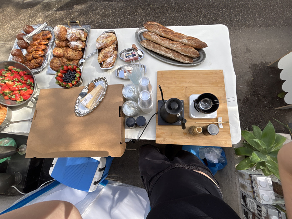 A table laden with pastries, fruit, and bread occupies the frame's upper half. Silver trays display croissants, danishes, and baguettes alongside bowls of strawberries and mixed berries. A brown cardboard box and beverage cooler sit below. To the right, a wooden tray holds a kettle, a bowl with a strainer, and matcha-making tools. A plant is situated on the right. A person in black clothing stands beneath the table.