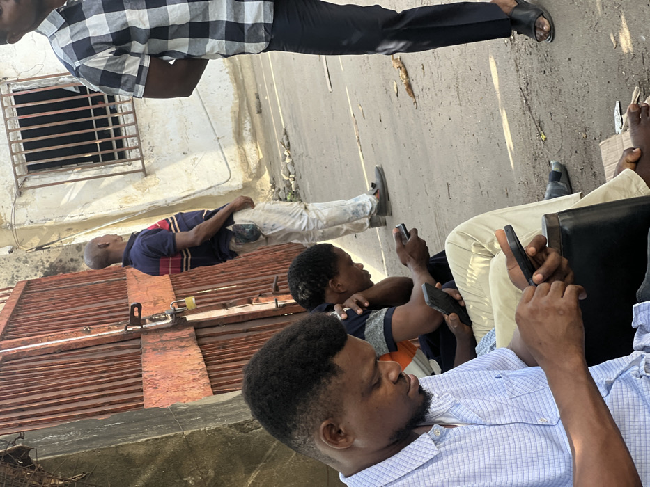 The scene depicts an outdoor urban environment in Ikeja, Nigeria. Four individuals are present. In the foreground left, a man with a beard and dark hair, wearing a light blue checkered shirt and light-colored trousers, is seated, engrossed in a black smartphone held in both hands. His bare feet are visible. Adjacent to him, a second seated individual, wearing a dark blue and grey striped shirt and light trousers, also focuses on a black smartphone. In the mid-ground right, a bald man wearing a dark blue polo shirt with red and white stripes and paint-stained white trousers stands facing left, hands at his side, looking towards a rusty reddish-brown corrugated metal gate secured by a yellow padlock. He wears dark loafers. To the far right, a fourth person, partially visible from the waist down, wears a plaid shirt and dark trousers with black slide sandals, hands behind their back. The background features a weathered, light-colored concrete wall with a metal-barred window. The ground is unpaved, consisting of dirt and scattered small stones and debris.