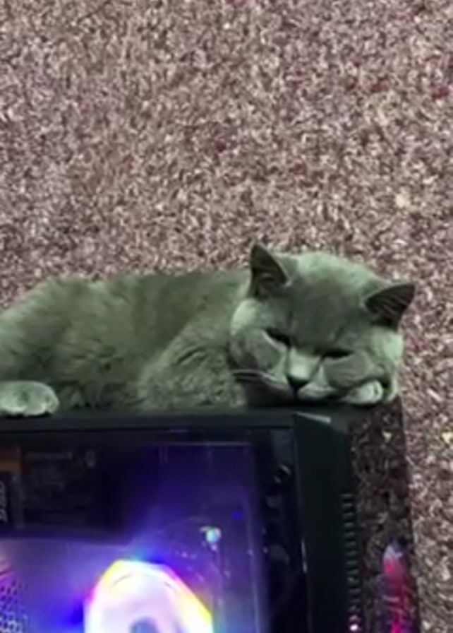 A medium, static shot shows a gray British Shorthair cat lying on top of a black computer tower