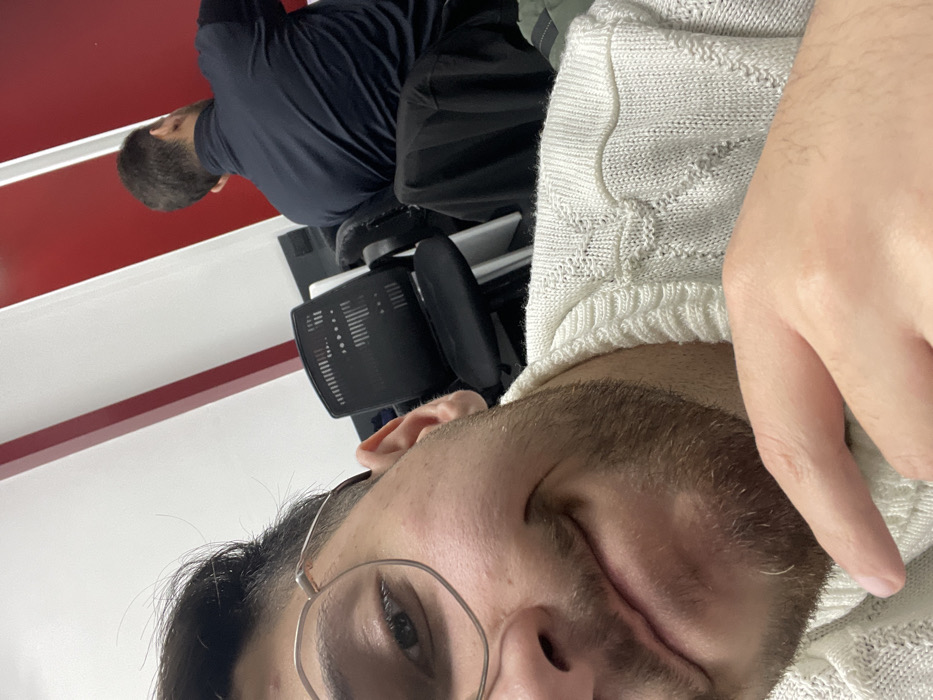 The image depicts an indoor scene, likely an office or communal work/study area, with no discernible specific landmarks within Homs, Syria. In the foreground, a young adult male is captured in a close-up, selfie-style shot, showing his right side. He has short dark hair, wears spectacles with thin frames, and has a light beard. He is dressed in a light-colored, possibly off-white, intricately knitted sweater. His right hand is partially visible in the lower-right quadrant. His expression is a subtle smirk or slight smile. In the mid-ground, slightly to the right of the foreground subject, another adult male is visible from behind, seated in a black ergonomic office chair with a mesh back. He has short dark hair and wears a dark blue long-sleeved top with a high collar; his lower body is obscured by dark fabric. An unoccupied identical black office chair is positioned to the left of the seated individual. The background wall features alternating vertical white and red panels or painted sections, indicating an interior room. The environment is brightly lit.