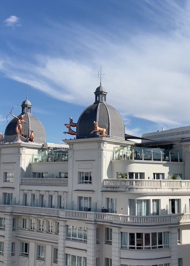 The video presents an upward view of a tall white building featuring ornate architectural details. The top of the building is adorned with a dome, topped with statues of running dogs. Next to this dome is another one with a statue of a woman with a bow. The building has multiple floors with windows and balconies, as well as an open-air terrace visible behind one of the domes, with people dining. The background features a bright blue sky with some wispy white clouds.