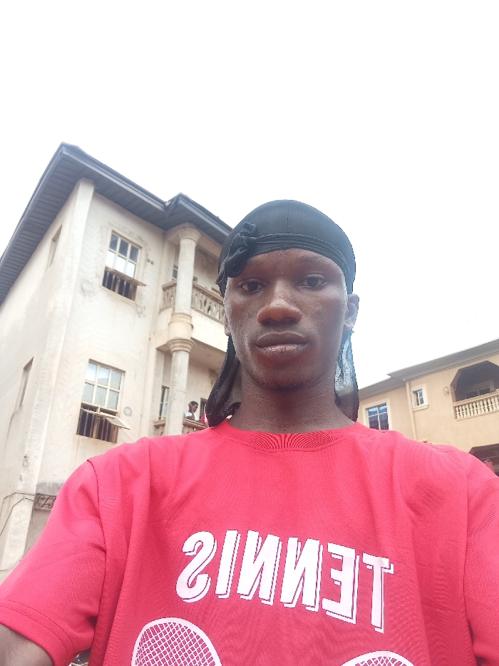 A head-and-shoulders portrait of a young Black male is centered in the foreground, captured from a selfie perspective. He is wearing a black durag and a red t-shirt with the reversed white text "TENNIS" and two tennis racket graphics printed on the chest. He gazes directly at the camera with a neutral expression. Behind him, a light-colored, multi-story building occupies the left and central background. This structure features multiple windows with outward-opening louvered shutters, decorative concrete balustrades on balconies, and two classical-style columns supporting an upper balcony. Two indistinct figures are partially visible on the second-story balcony of this building; one figure, appearing male, is partially obscured by a column. To the right, a section of another multi-story building, light brown or peach-colored with a similar balcony and balustrade, is visible. The sky above is uniformly bright white, suggesting an overcast day. The scene depicts an urban or semi-urban environment in the city of Nkwelle, Nigeria. The specific location within Nkwelle is not discernible from the visual information provided.