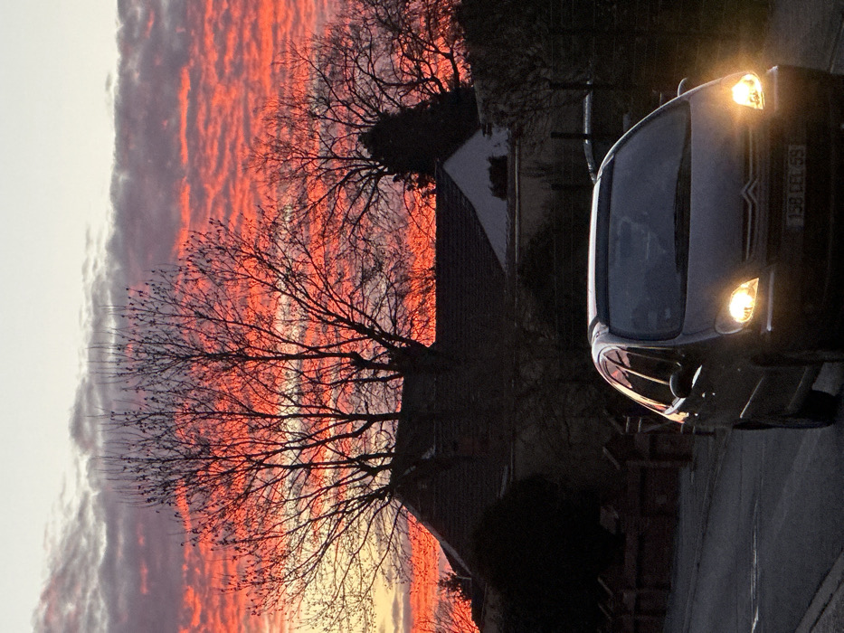 The image captures a twilight scene on a paved road in Carnin, France. The upper sky displays a vibrant red-orange hue with horizontal altocumulus cloud formations, transitioning to lighter yellow and grey tones at the zenith. Silhouetted against this bright sky are the bare, intricate branches of several deciduous trees. In the midground, partially obscured by the trees, are residential structures with dark tiled roofs and lighter-colored facades. A dark, possibly brick, wall lines the left side of the road. The foreground is dominated by a dark-colored Citroën Xsara Picasso minivan, traveling towards the viewer on the paved road. Both of the vehicle's headlights are illuminated, emitting a yellow light. The front license plate, "158 CEL 59," is clearly visible. The interior of the vehicle appears dark, with no discernible occupants. No other individuals or significant actions are present.