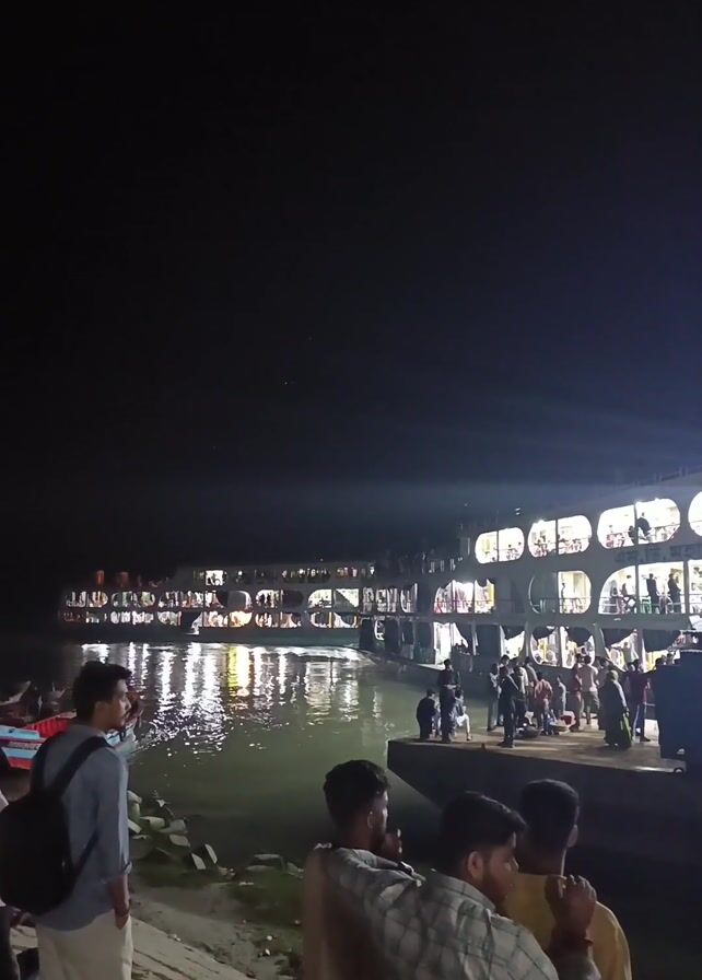 At night, a two-story boat with lit windows is docked at a pier, with many people visible inside