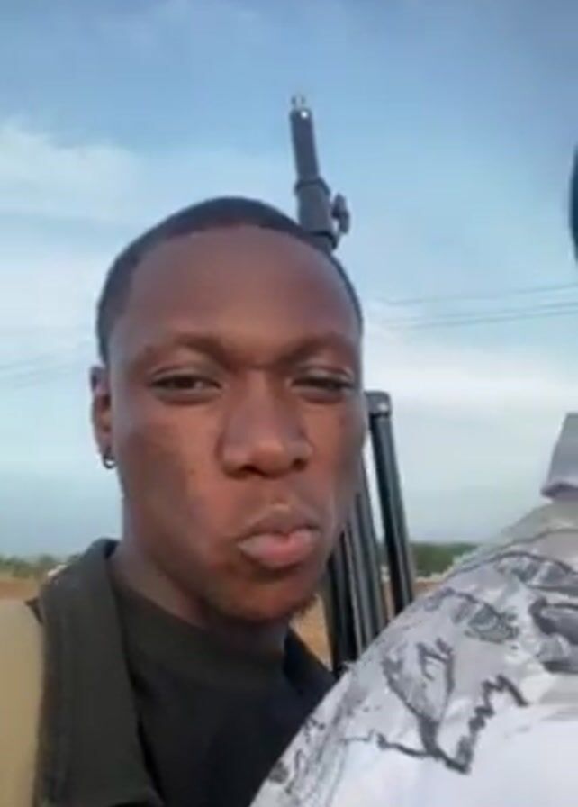 two Black men standing outdoors. The man in the foreground, wearing a dark jacket over a black shirt, looks directly at the camera. Behind him and slightly to his right, another man wearing a white shirt and a black baseball cap with a red bill is partially visible. A black pole, possibly a light stand, is positioned behind the first man. The sky is visible in the background, with a mix of blue and white clouds. In the distant background, there are trees and what appears to be a road or path. The audio suggests a windy environment.