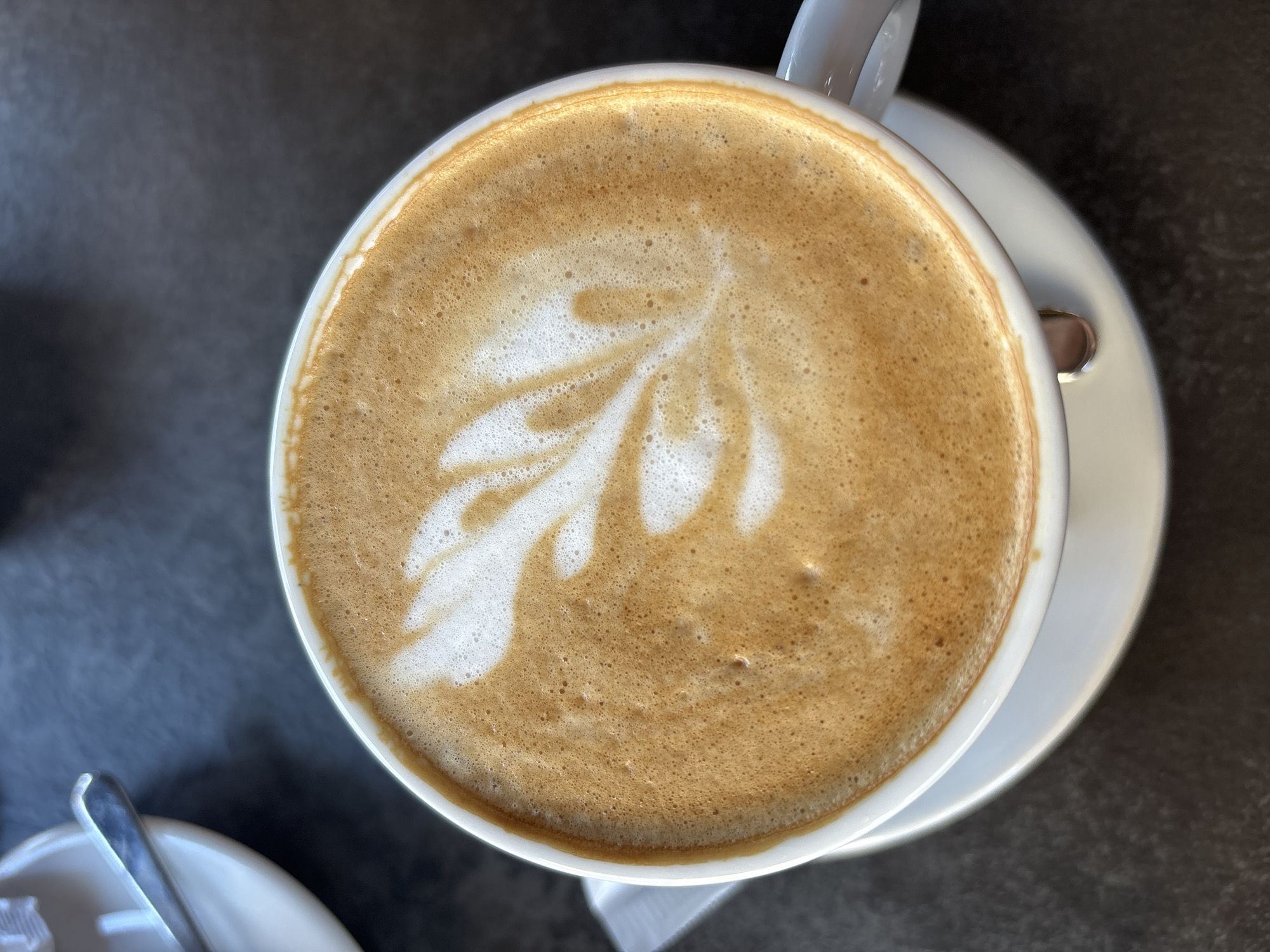 - "The image displays a close-up, overhead view of a hot beverage, identified as coffee with latte art, presented in a white ceramic cup" by FM-gHUTr1, licensed under CC BY 4.0