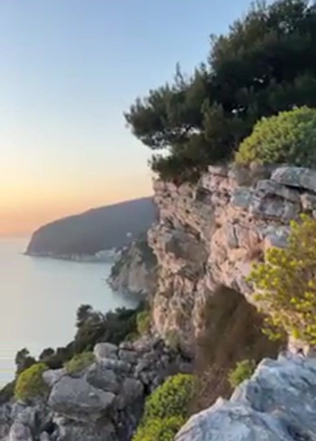 The video begins with a close-up of a rocky cliff with green and yellow plants. A tree is perched on top of the cliff. In the background, a coastline is visible. The camera pans upwards and outwards to reveal a body of water with a golden sunset reflecting off its surface. Two small islands are visible in the distance. The sky is a gradient of orange and blue.