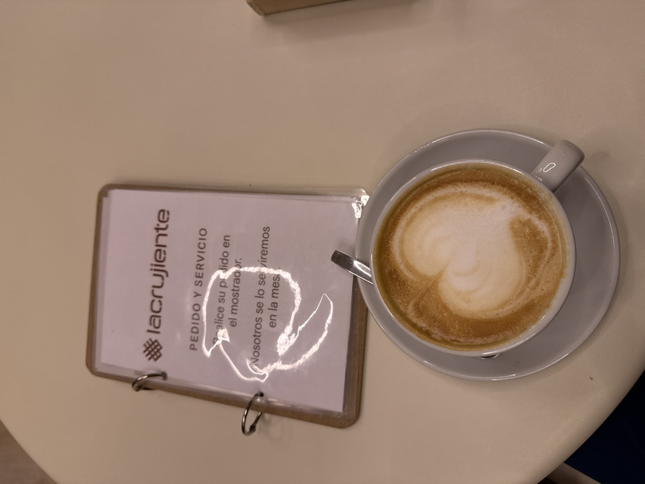 The image displays an overhead view of a table within a cafe or bakery identified as "lacrujiente" in Alcobendas, Spain