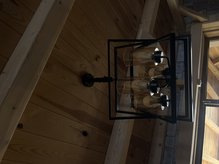 The scene depicts the interior of a structure located in Virak, Montenegro, viewed from a low-angle perspective. A prominent black, geometric chandelier with a rectangular outer frame is suspended from a wooden ceiling. The chandelier contains an inner four-arm structure holding four upward-facing light fixtures, each fitted with an amber-tinted cylindrical glass shade enclosing an unlit or very dimly lit, clear-glass incandescent-style light bulb. The ceiling consists of light brown wooden planks with visible grain patterns and dark knots, oriented horizontally across the upper portion of the frame. Two lighter-colored, untreated wooden beams are integrated into the ceiling structure: one extends horizontally across the top of the image, and another is partially visible on the upper left, running perpendicular to the planks. In the mid-ground, behind and below the chandelier, a dry-stacked stone wall is visible, composed of irregular grey and brown stones. Below this wall, a portion of a wooden-framed window or doorway is present, reflecting what appears to be another wooden ceiling or structural elements. The overall illumination of the environment is dim. No individuals are present, and no actions or interactions are occurring.