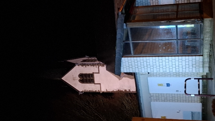 An illuminated church steeple rises against a dark night sky. A building with a brick facade and a large window sits adjacent to the church. A utility box with a hazard sign is positioned near the building's wall, and a metal railing is visible. Bare trees are silhouetted in the foreground.