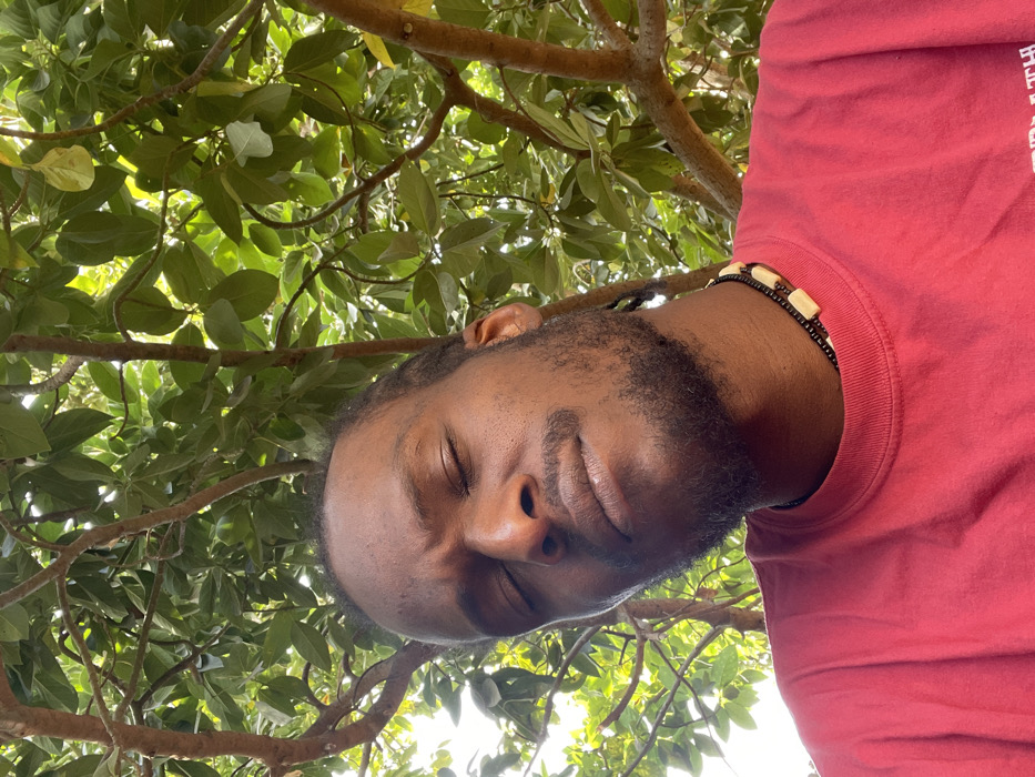 A close-up, chest-up image depicts a single adult male, appearing to be of African descent, with dark skin, a beard, and a mustache. His eyes are closed, and his head is slightly tilted upwards and to the left. He wears a plain red crew-neck t-shirt and a beaded necklace featuring small dark beads interspersed with light-colored, rectangular beads. The background is composed of dense green tree foliage and visible branches, indicating an outdoor setting with dappled sunlight filtering through the leaves. No specific visual identifiers are present in the image to determine a precise location within the city of Jos, Nigeria.