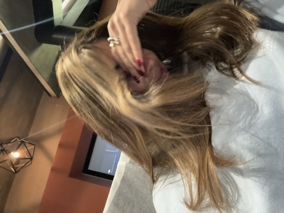A woman with long, highlighted brown hair covers her face with a hand adorned with a large ring. Her nails are painted red. She appears to be wearing a white garment. A geometric light fixture hangs in the background, and a window is visible against a warm, orange wall. The perspective is slightly angled, lending a casual feel to the image.