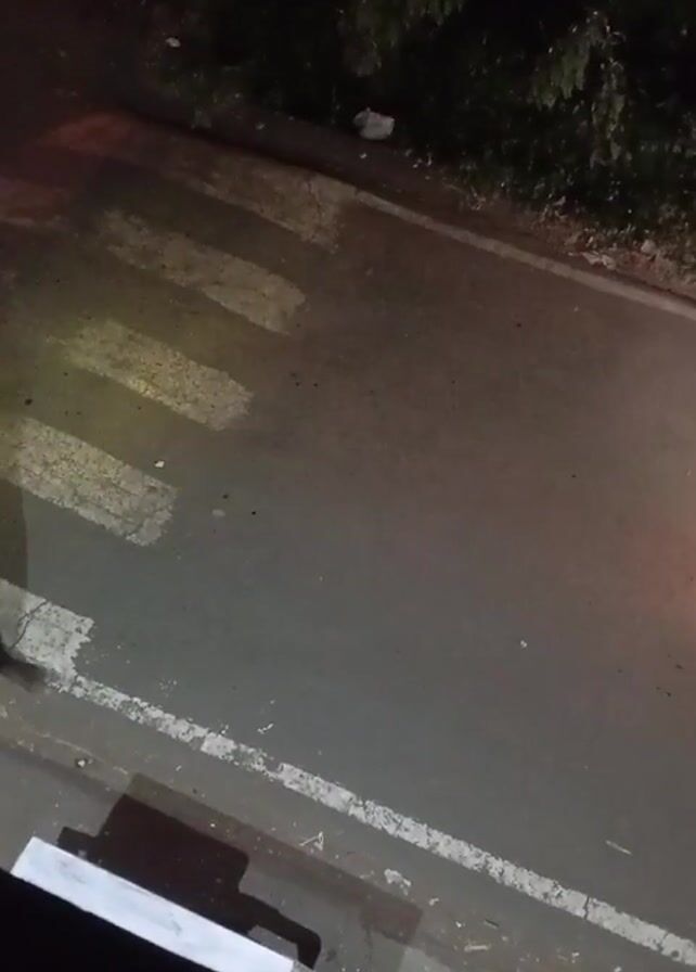 From an elevated perspective, the video depicts a pedestrian crossing a zebra crossing as a vehicle passes. It appears to be night, and the visibility is somewhat limited. The pedestrian, dressed in what appears to be a light-colored jacket, is walking across the crossing. The vehicle, a red van-like vehicle with distinctive lights and possible decals, speeds past the pedestrian. The surroundings include the road surface, the zebra crossing markings, a curb, and some vegetation on the side of the road. The focus of the video seems to be on capturing the interaction between the pedestrian and the vehicle at the crossing.