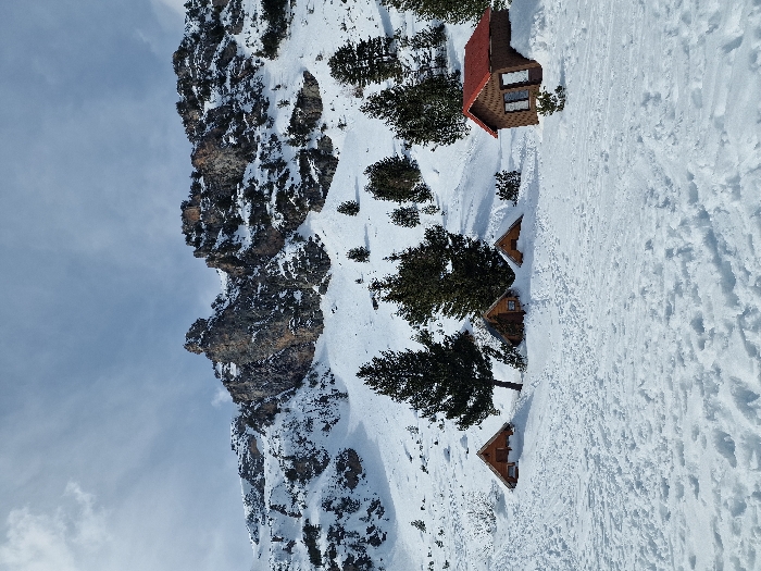 The image displays a snow-covered mountainous landscape located in Govedartsi, Bulgaria. In the foreground, a deep, undisturbed expanse of white snow stretches across the frame, exhibiting minor surface variations. The midground features four distinct wooden structures partially buried in this snow. On the left, three smaller wooden cabins are visible, primarily showcasing their dark brown gabled roofs and minimal upper wall sections, heavily integrated with the snow cover. To the right, a larger wooden cabin presents a reddish-brown gabled roof and two dark-framed windows on its visible front face, also partially submerged. Numerous dark green evergreen trees, some bearing snow, are interspersed among these cabins and further up the gentle snow-covered slopes. The background is dominated by a rugged mountain range, extensively covered in white snow, with prominent dark rock formations and cliffs, including a notable craggy peak towards the center-left. Scattered evergreen trees also adhere to the lower mountain slopes. The sky above is light blue with scattered thin, white clouds. No individuals, actions, or interactions are present in the scene.