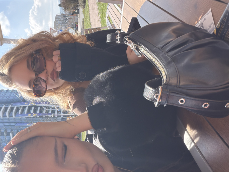 Two women are seated at an outdoor slatted wooden table at a commercial establishment in Sofia, Bulgaria, under natural daylight with a partly cloudy sky. The woman on the right, with light brown curly hair, wears tortoise-shell sunglasses, a black coat over a brown top, and rings on her left hand, which supports her chin while she poses with puckered lips. The woman on the left, partially visible, has dark hair, wears dark attire, and also poses with puckered lips, with her right hand resting on her head. A black hobo-style handbag with silver hardware and a gold-colored zipper rests on the table, along with a white paper receipt. In the background, a modern multi-story glass-fronted building is visible, adorned with multiple blue flags displaying a yellow "M" logo, indicative of McDonald's, suggesting a location near a major commercial artery like Tsarigradsko Shose. A road with distant vehicles and trees leads to distant mountains on the horizon.