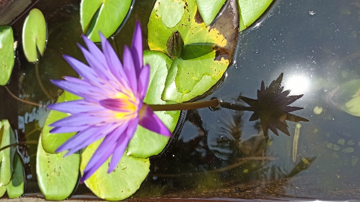 - "The scene depicts a purple water lily (Nymphaea) in full bloom, centrally positioned within a dark, reflective body of water, located in Kigali City, Rwanda" by FM-oIWu62, licensed under CC BY 4.0
