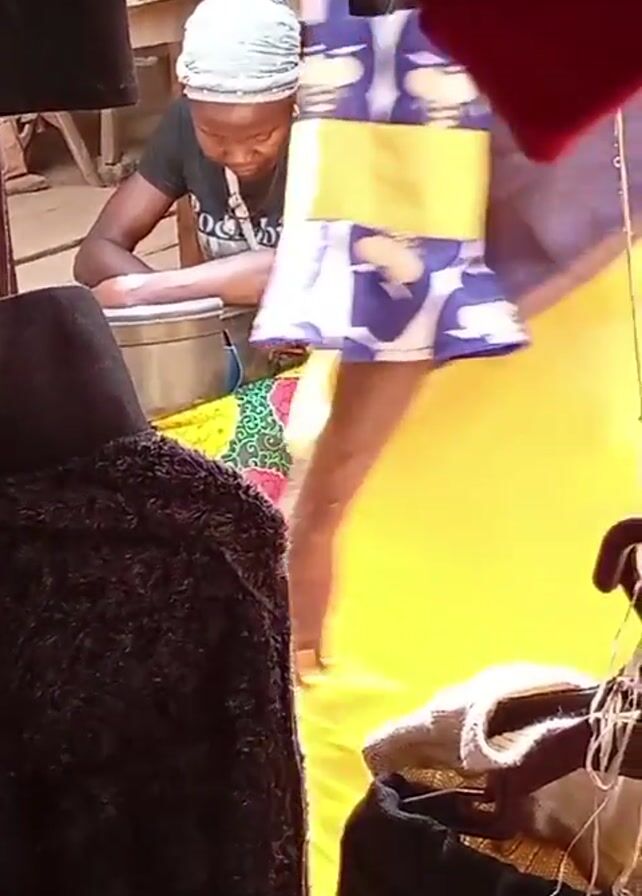 A woman is sitting on a blue crate behind a stall in what appears to be an outdoor market. She is wearing a dark t-shirt, a light-colored headwrap, and a colorful fabric wrap around her waist. She is bending over a silver pot placed on the table in front of her. Her left arm is resting on the pot. There are hanging clothes in the foreground, partially obstructing the view of the woman. Other market structures are visible in the background. The ground appears to be sandy or dirt.