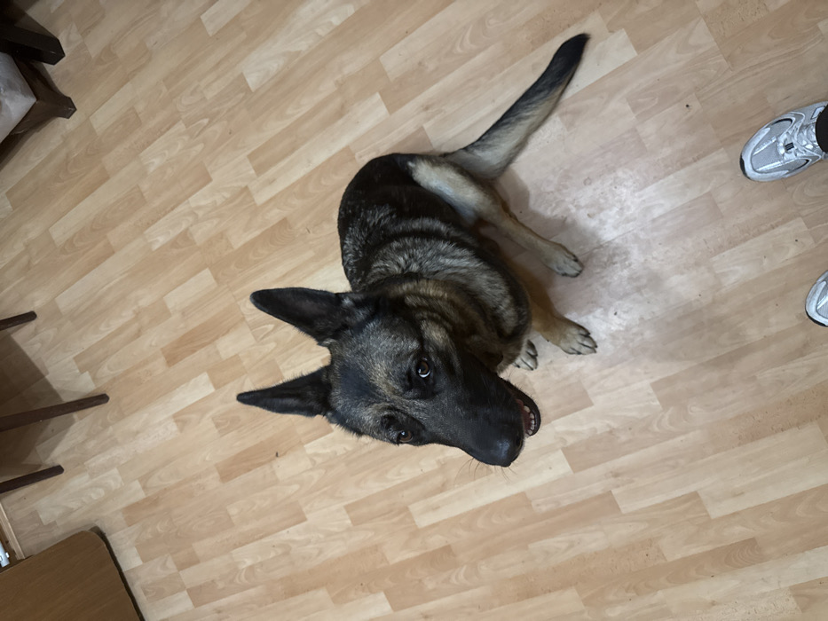 - "A German Shepherd dog sits on a wooden-patterned floor, looking up" by FM-LKUBm1, licensed under CC BY 4.0