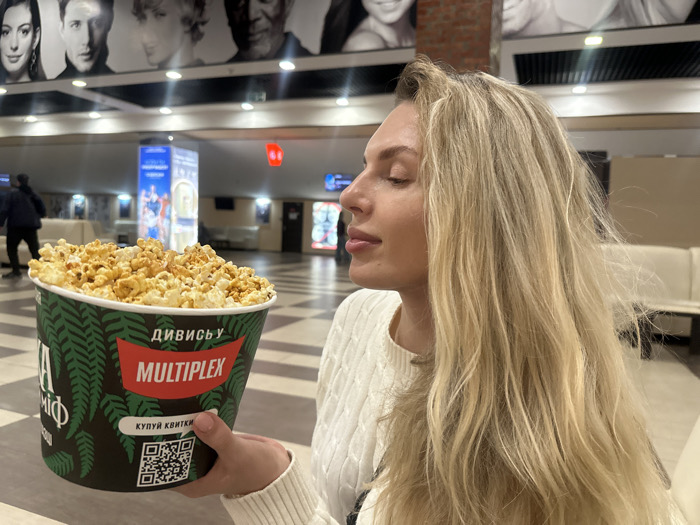 A young adult female with long, light blonde hair, wearing a white cable-knit sweater, is depicted in the foreground of an indoor scene, likely a cinema lobby in a Multiplex cinema, specifically one located in Ukraine, consistent with the DAFI shopping mall in Dnipro, within the Slobozhanske area