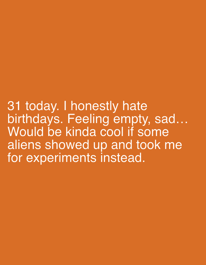 The image displays white sans-serif text centered vertically on a solid orange background. The text reads: "31 today. I honestly hate birthdays. Feeling empty, sad... Would be kinda cool if some aliens showed up and took me for experiments instead." No people, subjects, objects, actions, or interactions are visually depicted in the image. The environment is a digital graphic with a monochromatic orange background. The image contains no visual information or contextual cues to determine a specific physical location within Ramat Gan, Israel, or any other geographical area.
